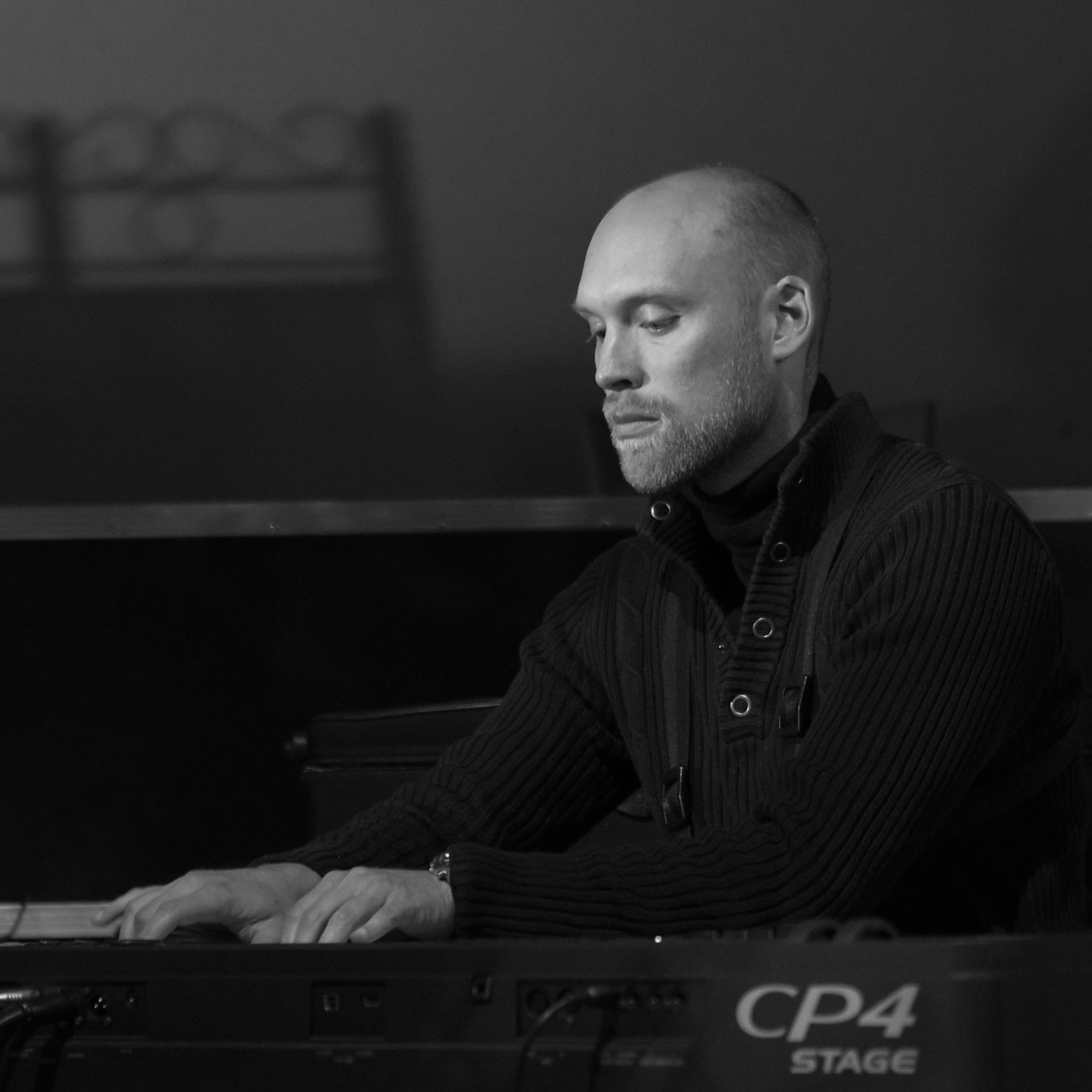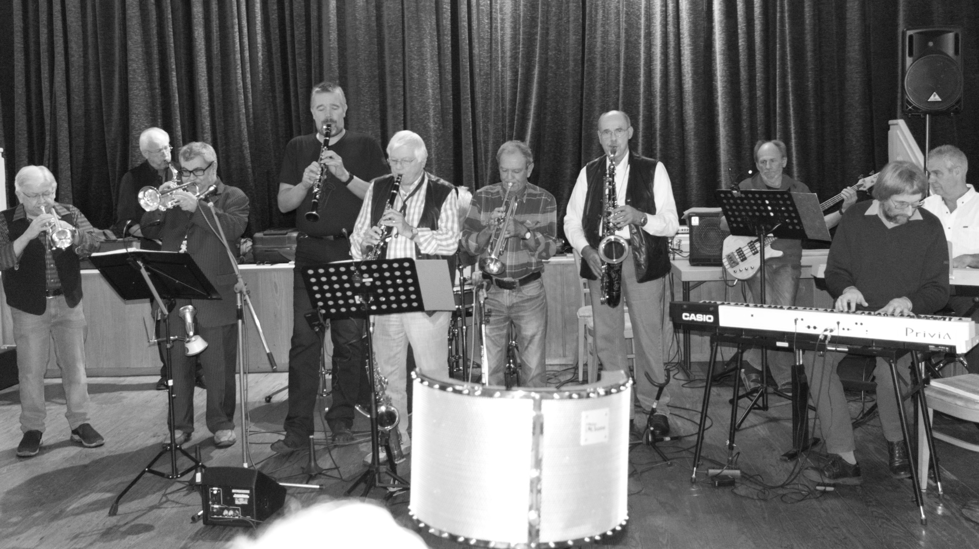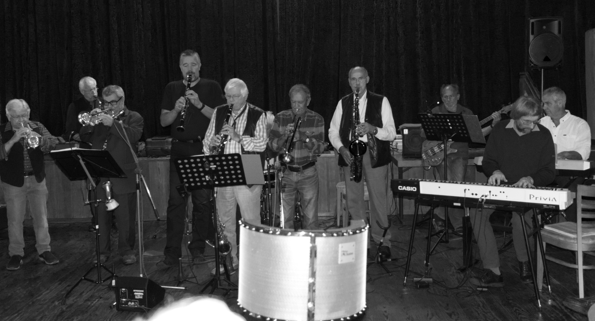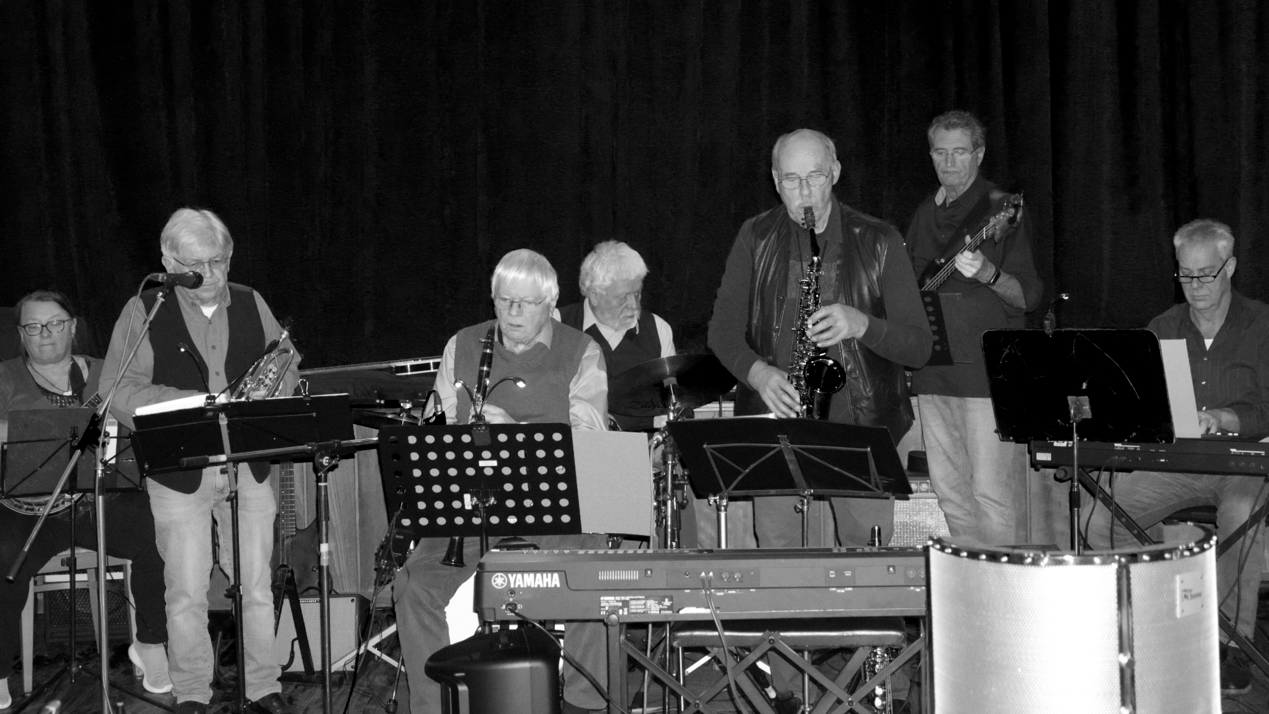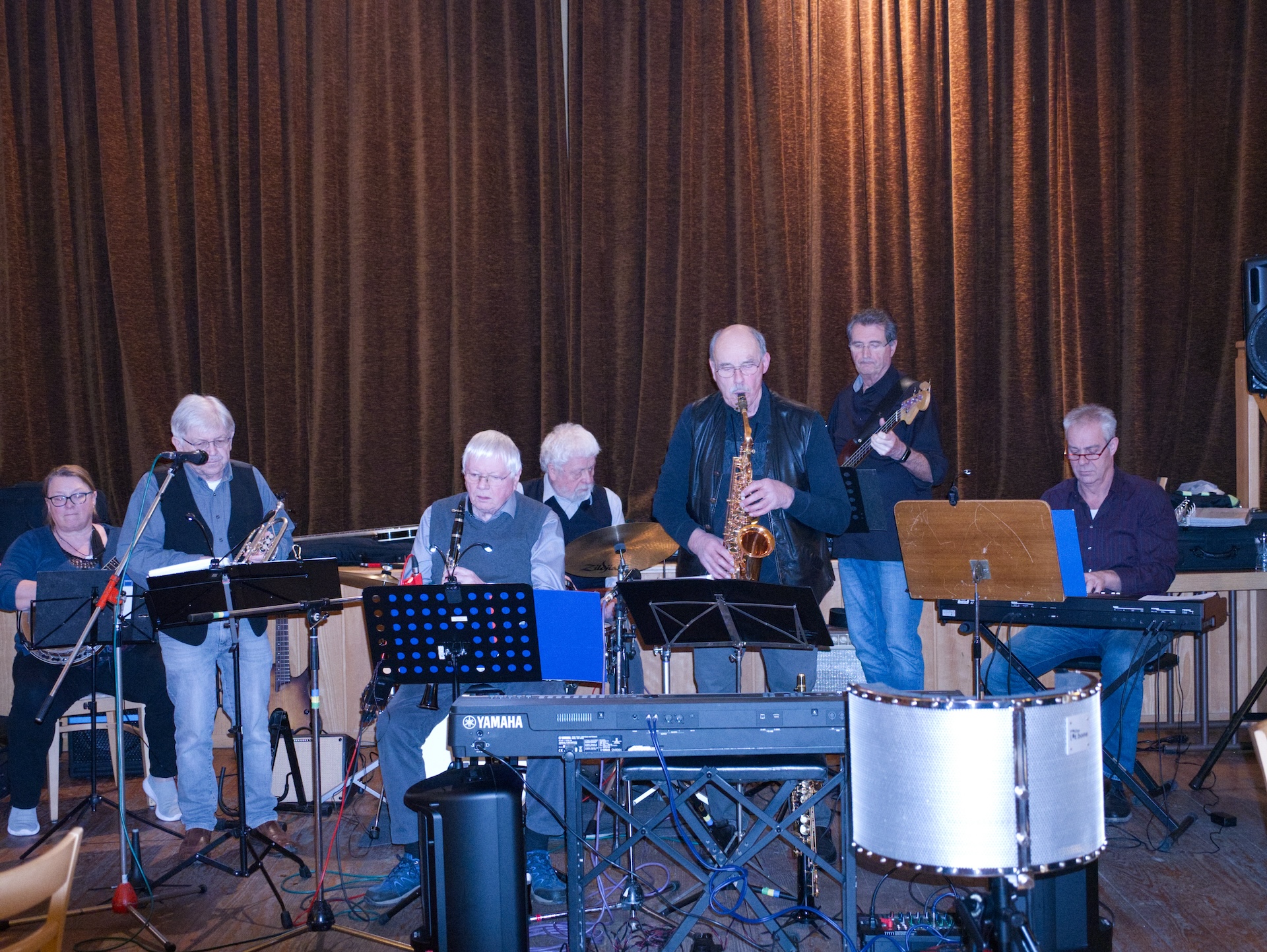(wird von oben beleuchtet) hinter den Musikern.