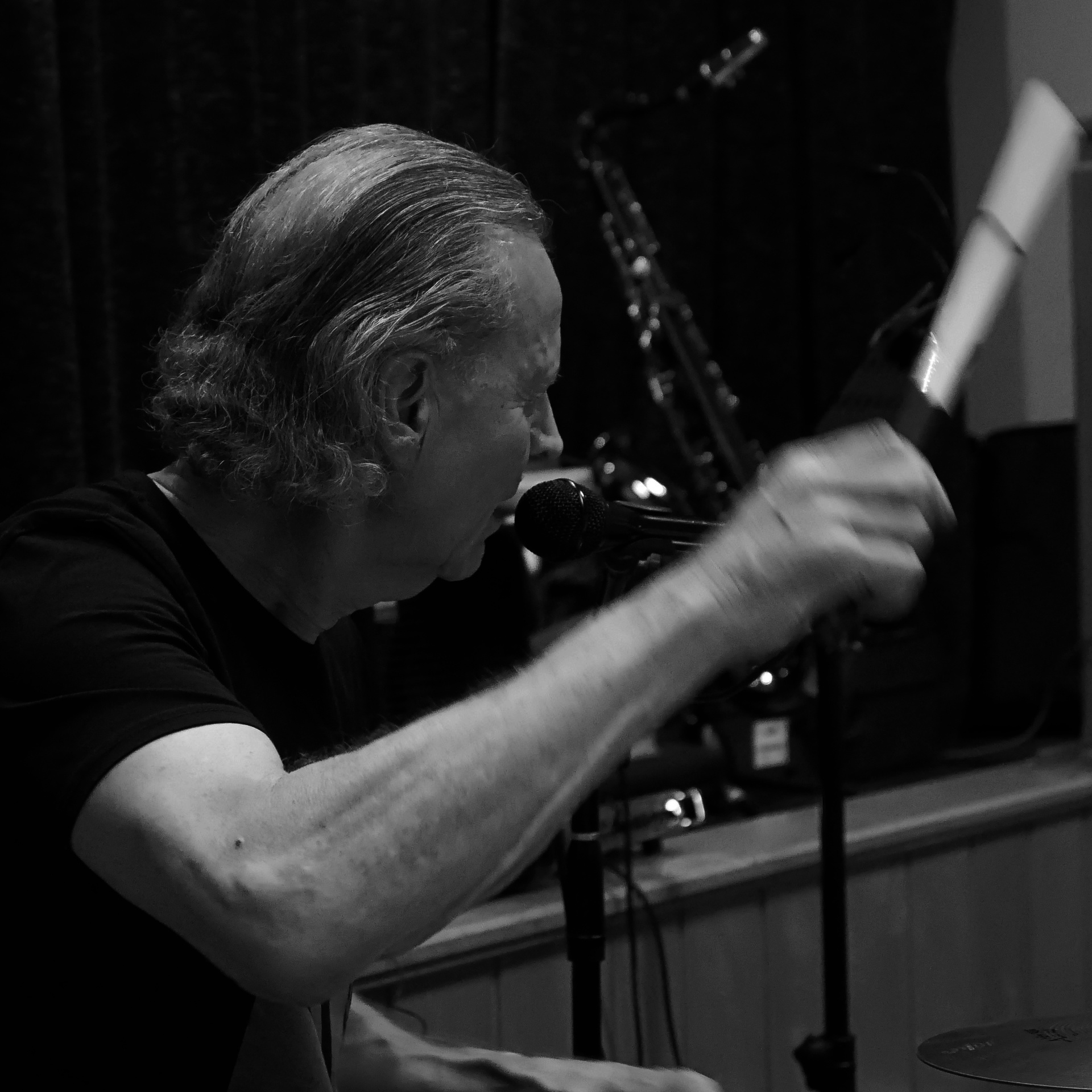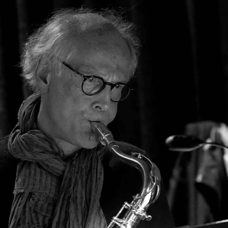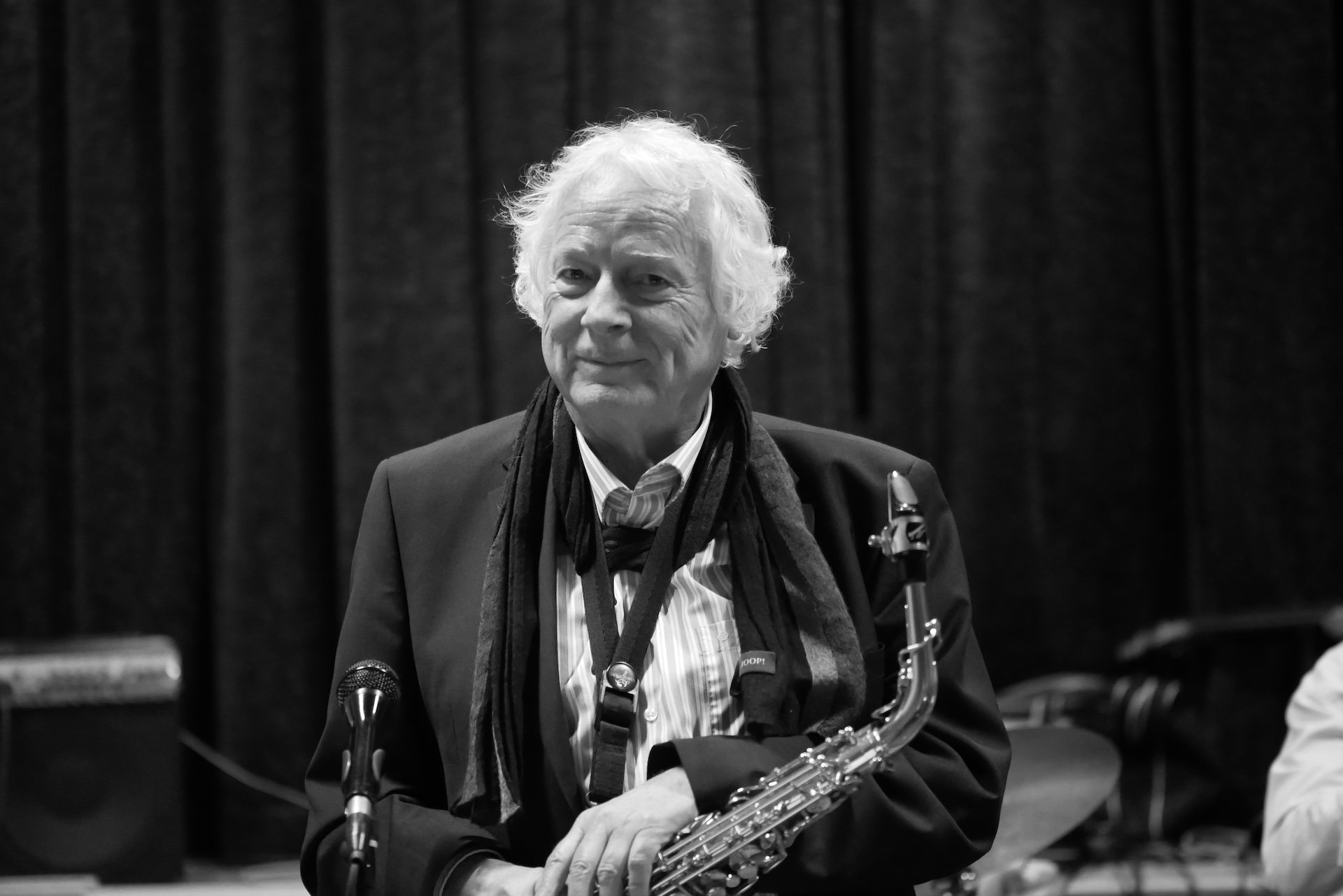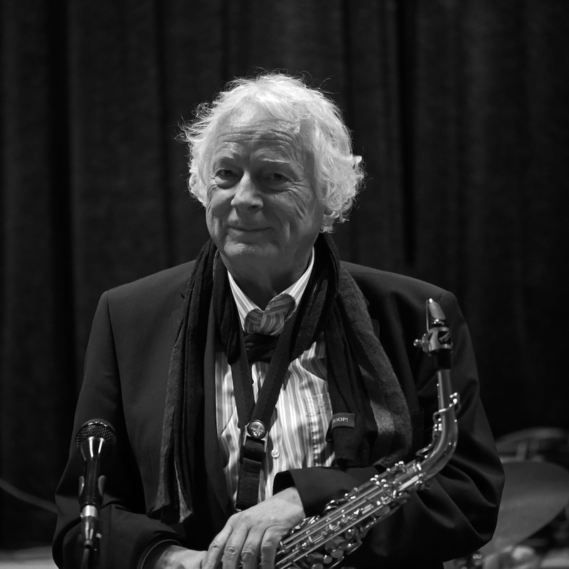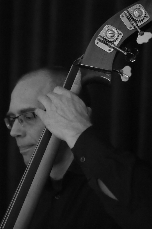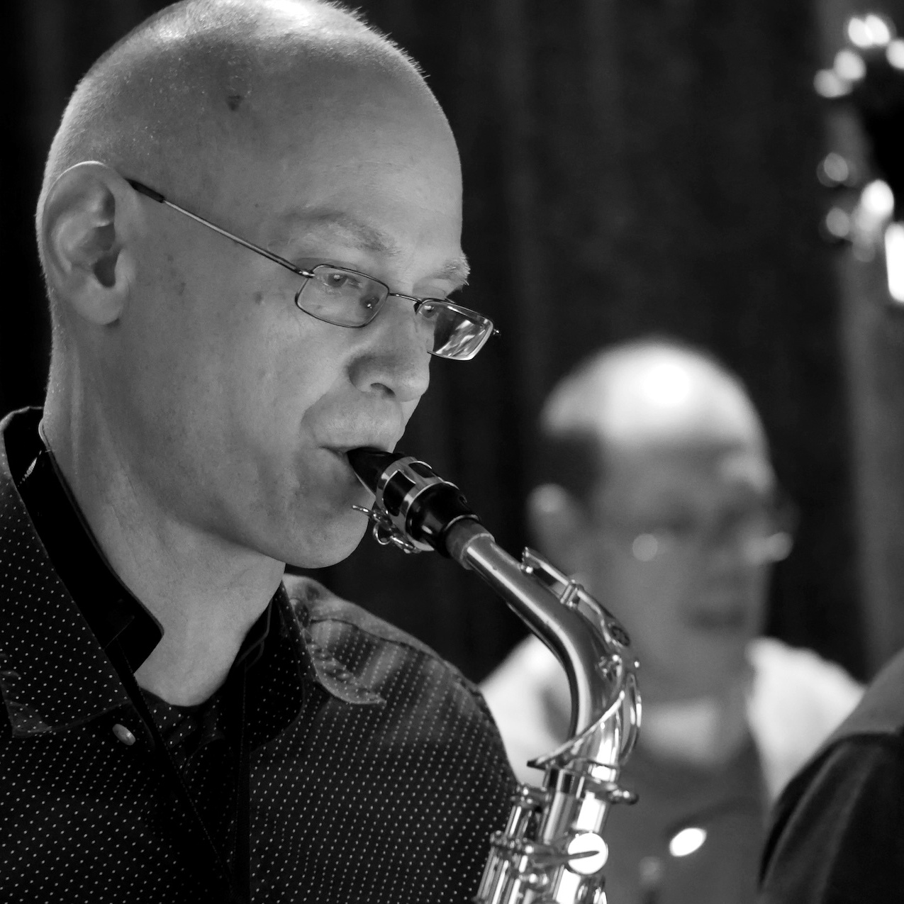 Saxophonist mit Bass im Hintergrund.