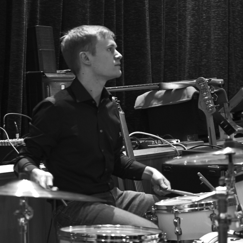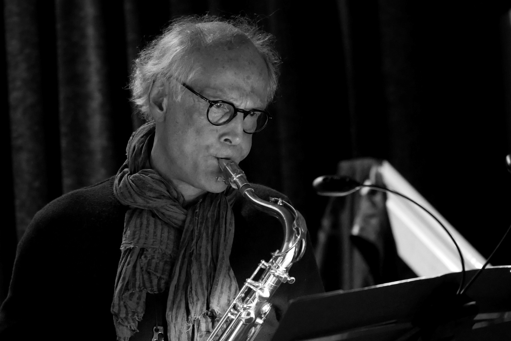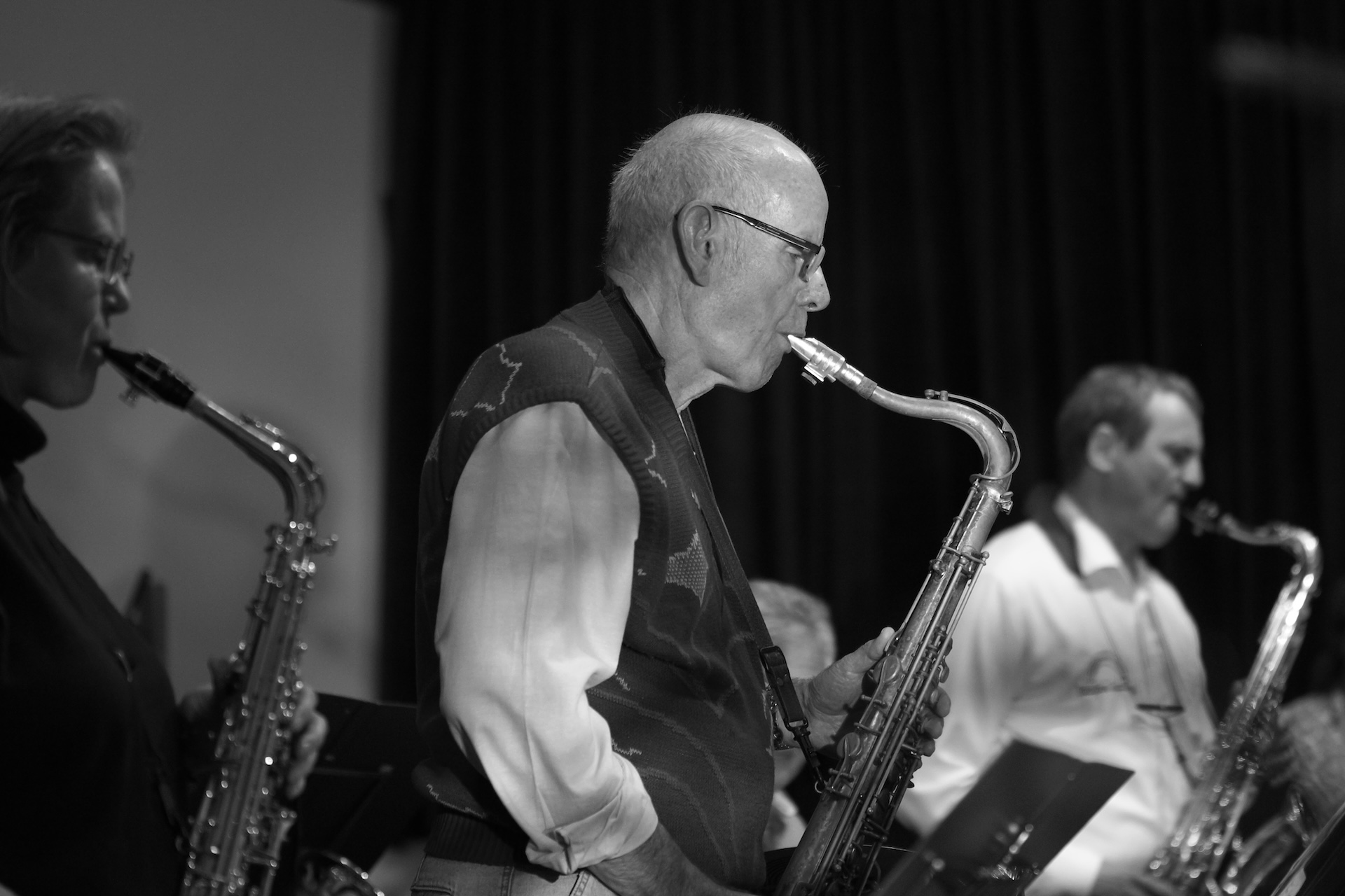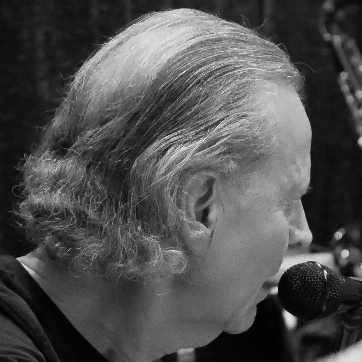 Saxophonist mit Bass im Hintergrund.