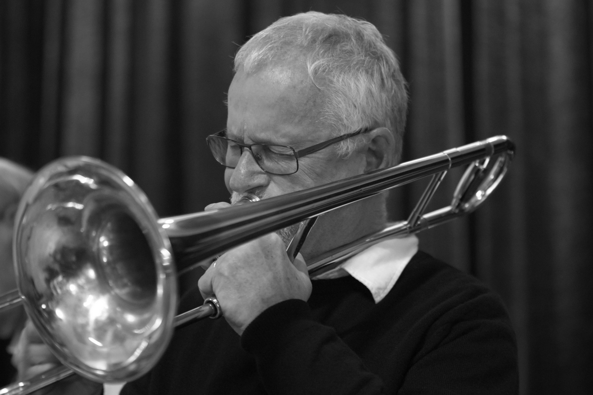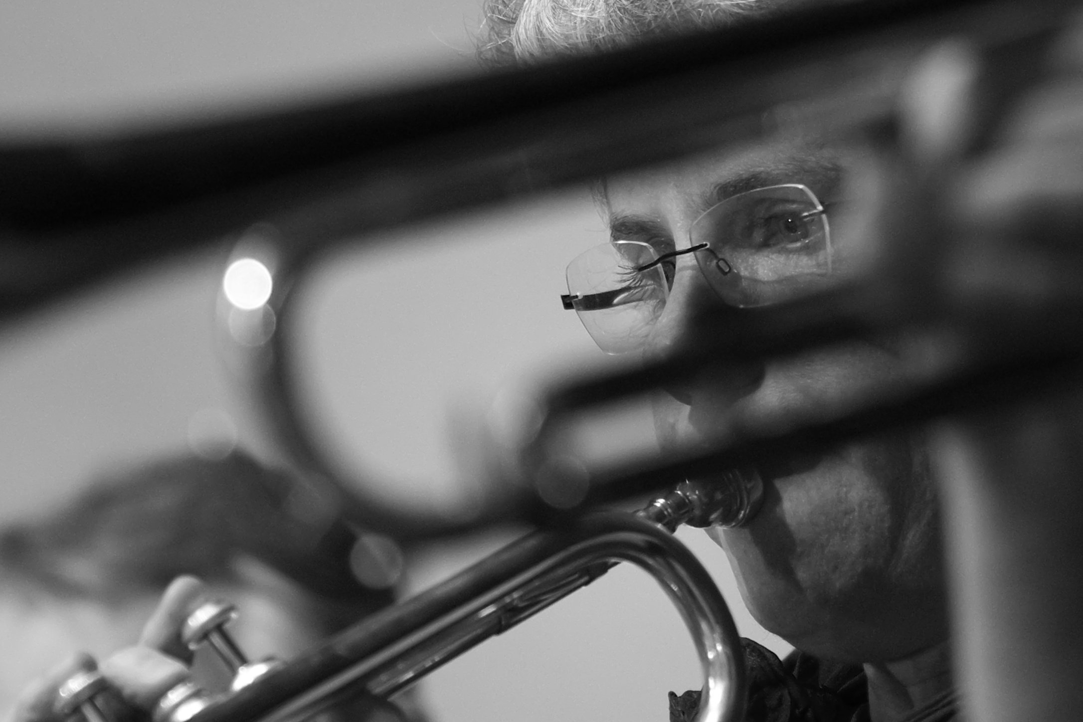 linken Auge. Finger auf der Trompete schon unscharf.